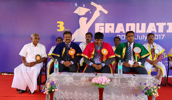 Addressing the gathering, Prof.Dr.S.Ganesan said that indeed Graduation day is a fun filled event. He profusely thanked the organizers for inviting him as a chief guest and congratulated all the graduates. He took the audience through four different eras of graduation starting with the “ Saraswathy devi” as quoted in Kalaivani Upanishad to present day graduation ceremonies Prof.Dr.S.Ganesan described education as freedom to pursue what you want. He also gave insights from the famous lecture of Steve Jobs at Stanford University popularly known as “Stay Hungary Stay foolish”. He concluded the address by saying that education is all about being curious to assimilate more knowledge. He also advised the students to become an entrepreneur taking the example our chairman & his father THIRU.K.PERIASAMY.