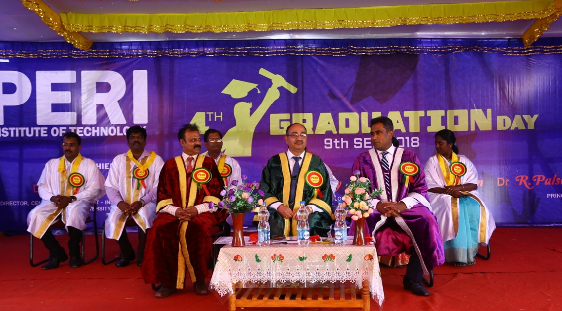 PERI Institute of Technology celebrated its 4th Graduation day on 9th September 2018 at the campus. The convocation begun with the academic procession of the dignitaries. The Chief Guest for the Convocation was Dr.T.Thyagarajan, Director of University–Industry Interaction cell, Anna University. The chief guest, Chairman Mr. Saravanan Periyasami, Principal of the Institution Dr. Palson Kennedy, Heads of various departments were accompanied by a band into the venue of the ceremony.